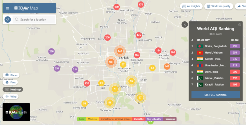 В рейтинге крупнейших городов мира по качеству воздуха World Air Quality Бишкек опустился на 30-е место.