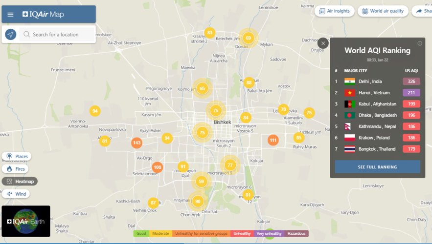 В рейтинге крупнейших городов мира по качеству воздуха World Air Quality Бишкек опустился на 37-е место.