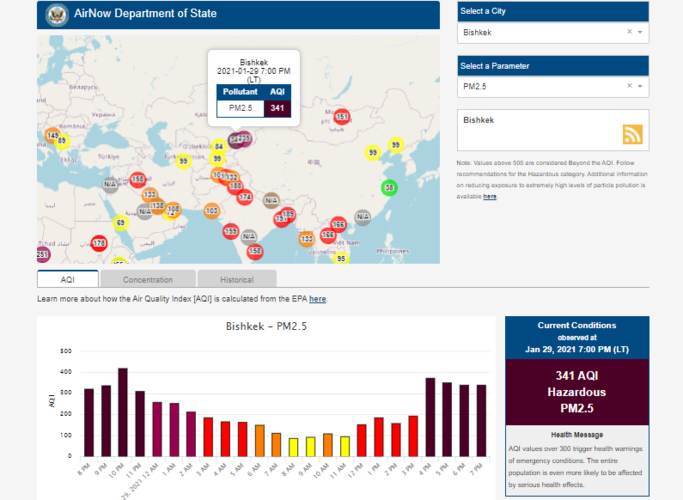 Посольство США в Кыргызстане также установило датчик. Информация обновляется каждый час. На 19.00 индекс качества воздуха в районе дипломатической миссии — 341 (AQI).