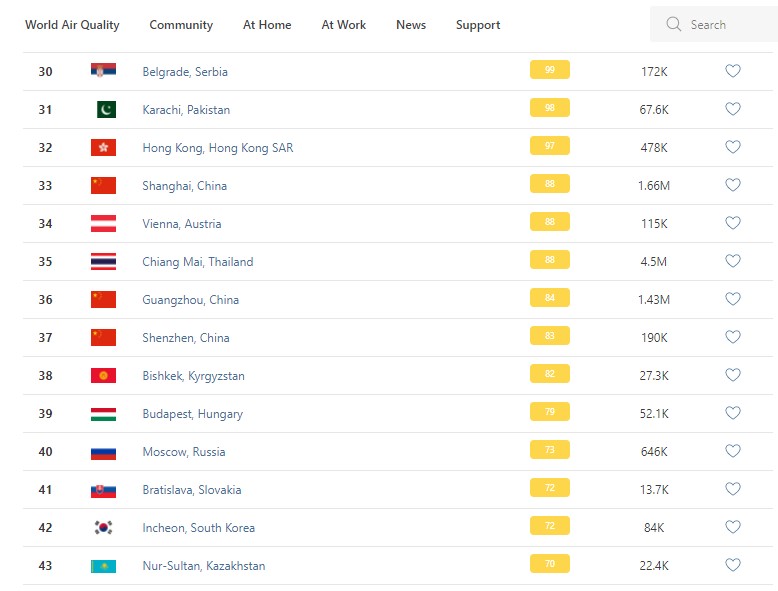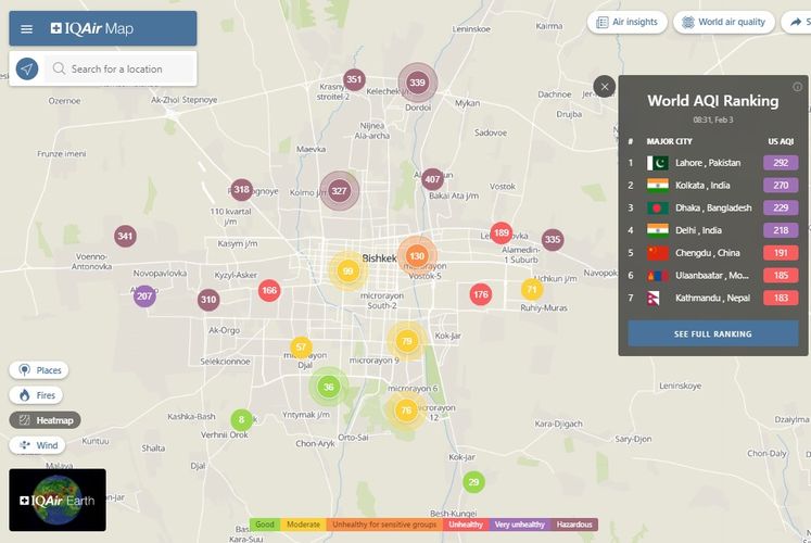 В рейтинге крупнейших городов мира по качеству воздуха World Air Quality Бишкек опустился на 38-е место.