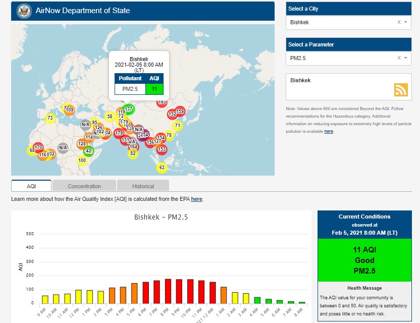 Посольство США в Кыргызстане также установило датчик. Информация обновляется каждый час. На 8.00 индекс качества воздуха в районе дипломатической миссии — 11 (AQI).
