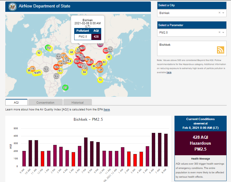 Посольство США в Кыргызстане также установило датчик. Информация обновляется каждый час. На 9.00 индекс качества воздуха в районе дипломатической миссии — 428 (AQI).