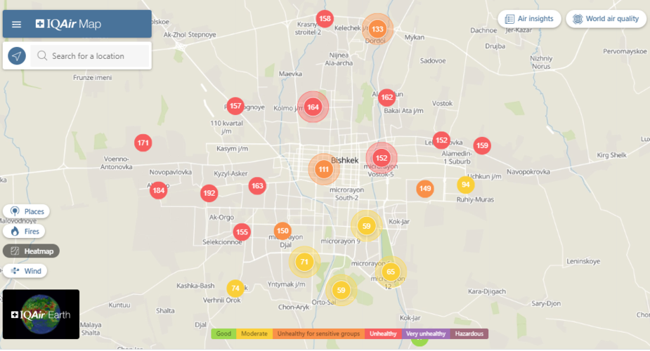 Общественный фонд «Институт экологических решений» установил датчики в столице и пригороде. На карте можно увидеть среднее значение AQI в разных районах Бишкека. Его обновляют ежечасно.