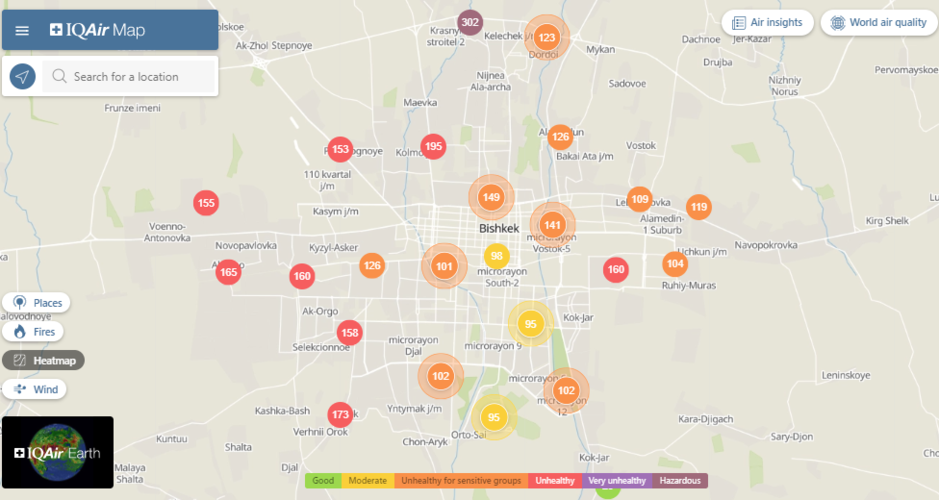 Общественный фонд «Институт экологических решений» установил датчики в столице и пригороде. На карте можно увидеть среднее значение AQI в разных районах Бишкека. Его обновляют ежечасно.