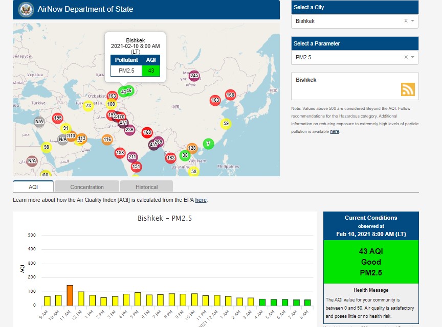 Посольство США в Кыргызстане также установило датчик. Информация обновляется каждый час. На 8.00 индекс качества воздуха в районе дипломатической миссии — 43 (AQI).
