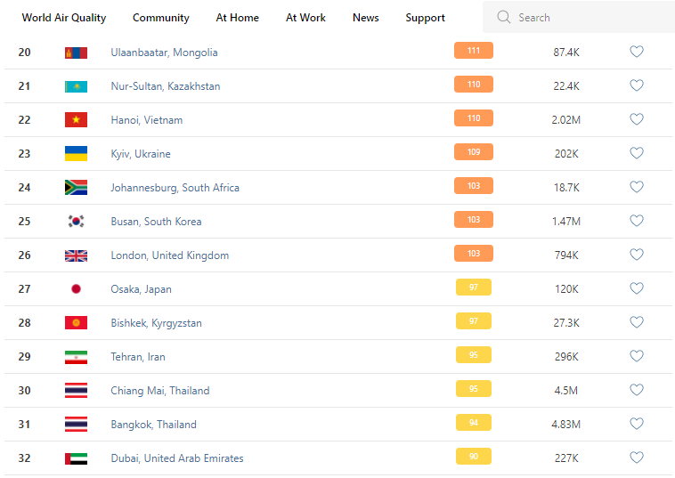 В рейтинге крупнейших городов мира по качеству воздуха World Air Quality Бишкек поднялся на 28-е место.