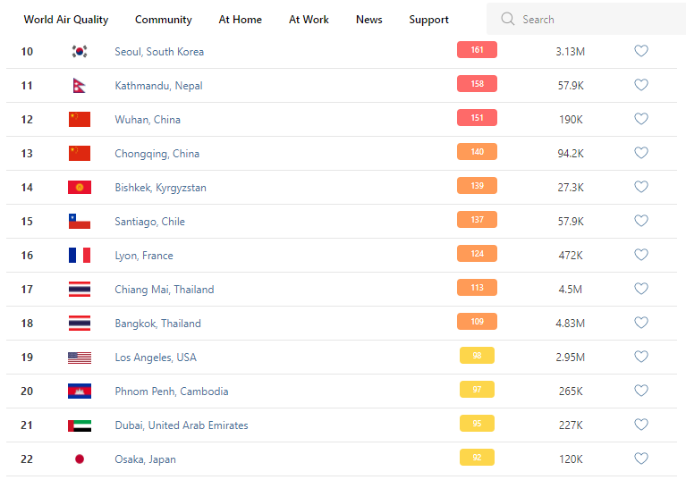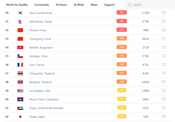 В рейтинге крупнейших городов мира по качеству воздуха World Air Quality Бишкек поднялся на 14-е место.
