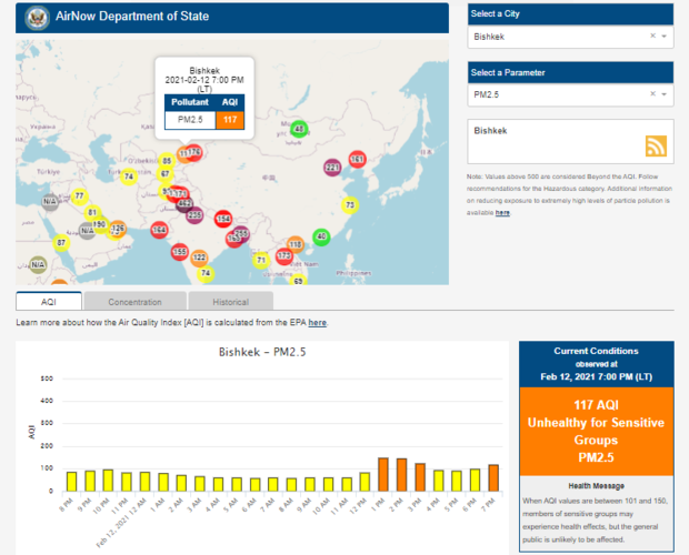 Посольство США в Кыргызстане также установило датчик. Информация обновляется каждый час. На 19.00 индекс качества воздуха в районе дипломатической миссии — 117 (AQI).