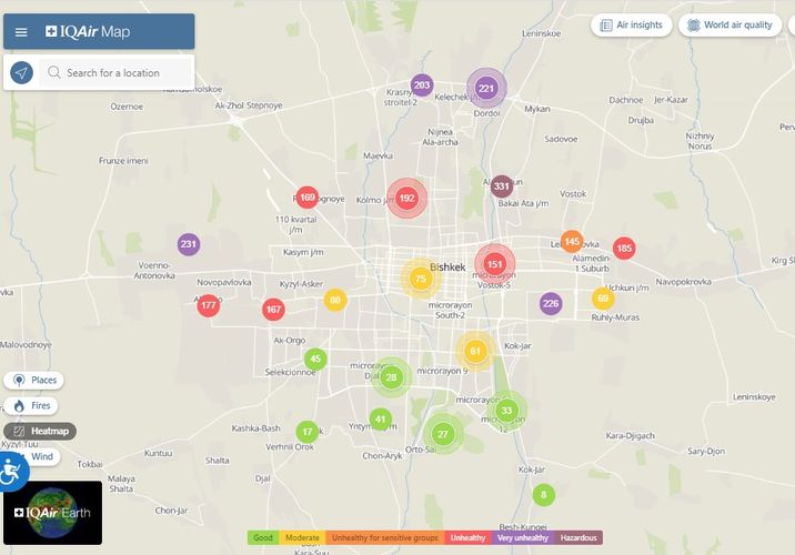 Общественный фонд «Институт экологических решений» установил датчики в столице и пригороде. На карте можно увидеть среднее значение AQI в разных районах Бишкека. Его обновляют ежечасно.