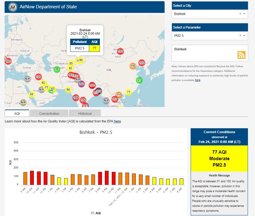 Посольство США в Кыргызстане также установило датчик. Информация обновляется каждый час. На 8.00 индекс качества воздуха в районе дипломатической миссии — 77 (AQI).