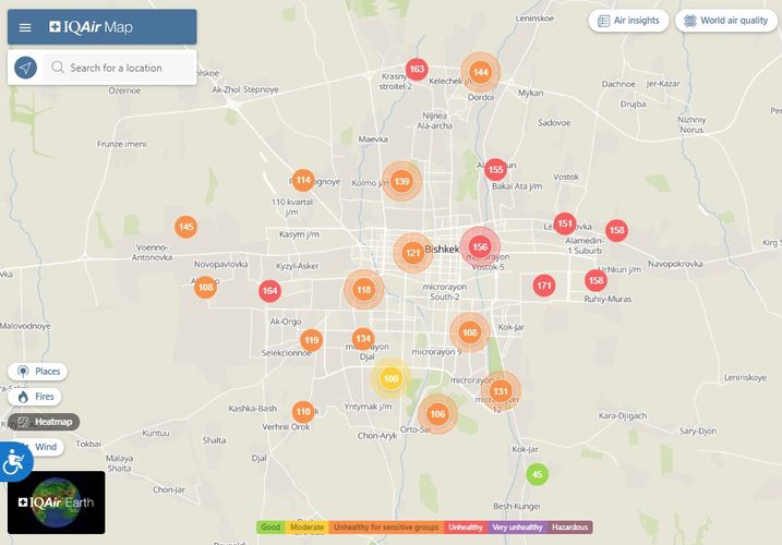 Общественный фонд «Институт экологических решений» установил датчики в столице и пригороде. На карте можно увидеть среднее значение AQI в разных районах Бишкека. Его обновляют ежечасно.