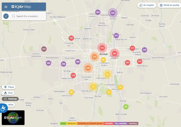 Общественный фонд «Институт экологических решений» установил датчики в столице и пригороде. На карте можно увидеть среднее значение AQI в разных районах Бишкека. Его обновляют ежечасно.