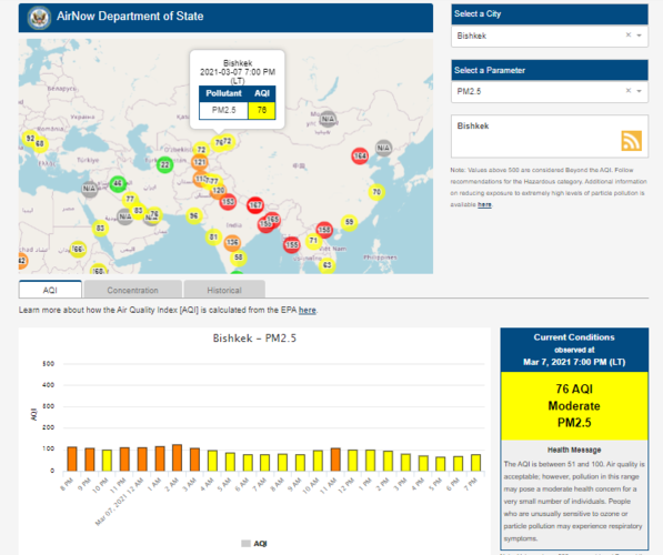 Посольство США в Кыргызстане также установило датчик. Информация обновляется каждый час. На 19.00 индекс качества воздуха в районе дипломатической миссии — 76 (AQI).