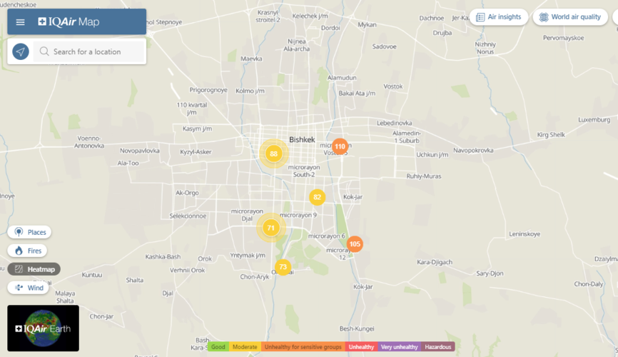 Общественный фонд «Институт экологических решений» установил датчики в столице и пригороде. На карте можно увидеть среднее значение AQI в разных районах Бишкека. Его обновляют ежечасно.