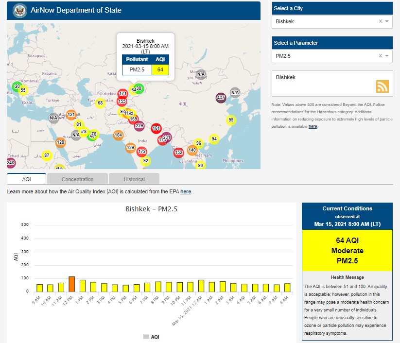 Посольство США в Кыргызстане также установило датчик. Информация обновляется каждый час. На 8.00 индекс качества воздуха в районе дипломатической миссии — 64 (AQI).