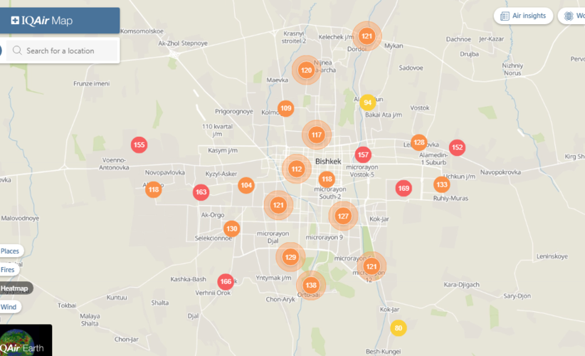 Общественный фонд «Институт экологических решений» установил датчики в столице и пригороде. На карте можно увидеть среднее значение AQI в разных районах Бишкека. Его обновляют ежечасно.