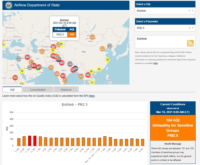 Посольство США в Кыргызстане также установило датчик. Информация обновляется каждый час. На 8.00 индекс качества воздуха в районе дипломатической миссии — 104 (AQI).