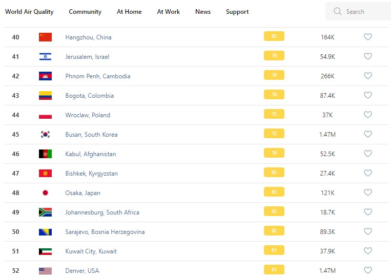 В рейтинге крупнейших городов мира по качеству воздуха World Air Quality Бишкек опустился на 47-е место.