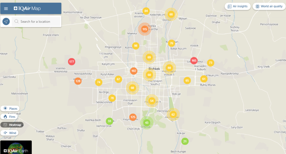 Общественный фонд «Институт экологических решений» установил датчики в столице и пригороде. На карте можно увидеть среднее значение AQI в разных районах Бишкека. Его обновляют ежечасно.