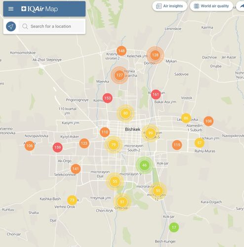 Общественный фонд «Институт экологических решений» установил датчики в столице и пригороде. На карте можно увидеть среднее значение AQI в разных районах Бишкека. Его обновляют ежечасно.Посольство США в Кыргызстане также установило датчик. Информация обновляется каждый час. На 19.00 индекс качества воздуха в районе дипломатической миссии — 28 (AQI).