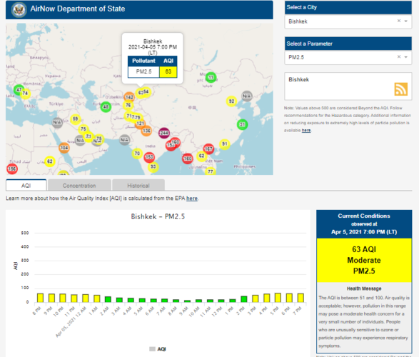 Посольство США в Кыргызстане также установило датчик. Информация обновляется каждый час. На 19.00 индекс качества воздуха в районе дипломатической миссии — 63 (AQI).