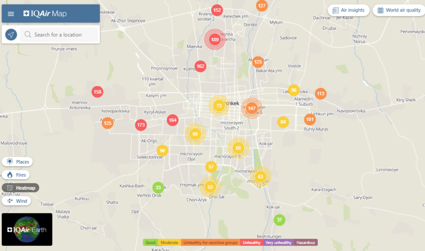 Общественный фонд «Институт экологических решений» установил датчики в столице и пригороде. На карте можно увидеть среднее значение AQI в разных районах Бишкека. Его обновляют ежечасно.