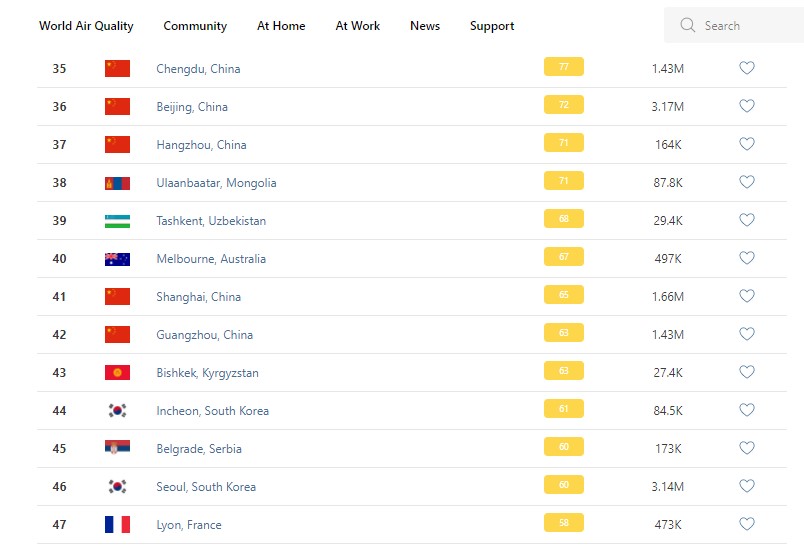 В рейтинге крупнейших городов мира по качеству воздуха World Air Quality Бишкек опустился на 43-е место.