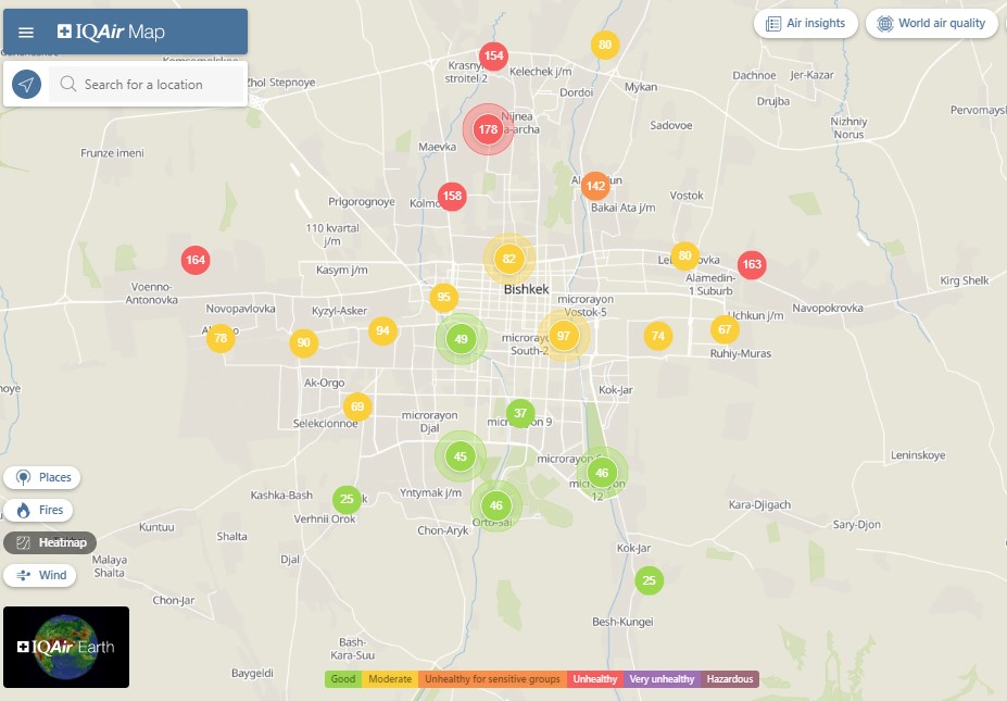 Общественный фонд «Институт экологических решений» установил датчики в столице и пригороде. На карте можно увидеть среднее значение AQI в разных районах Бишкека. Его обновляют ежечасно.