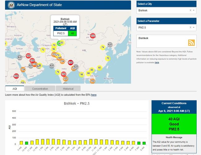 Посольство США в Кыргызстане также установило датчик. Информация обновляется каждый час. На 8.00 индекс качества воздуха в районе дипломатической миссии — 40 (AQI).