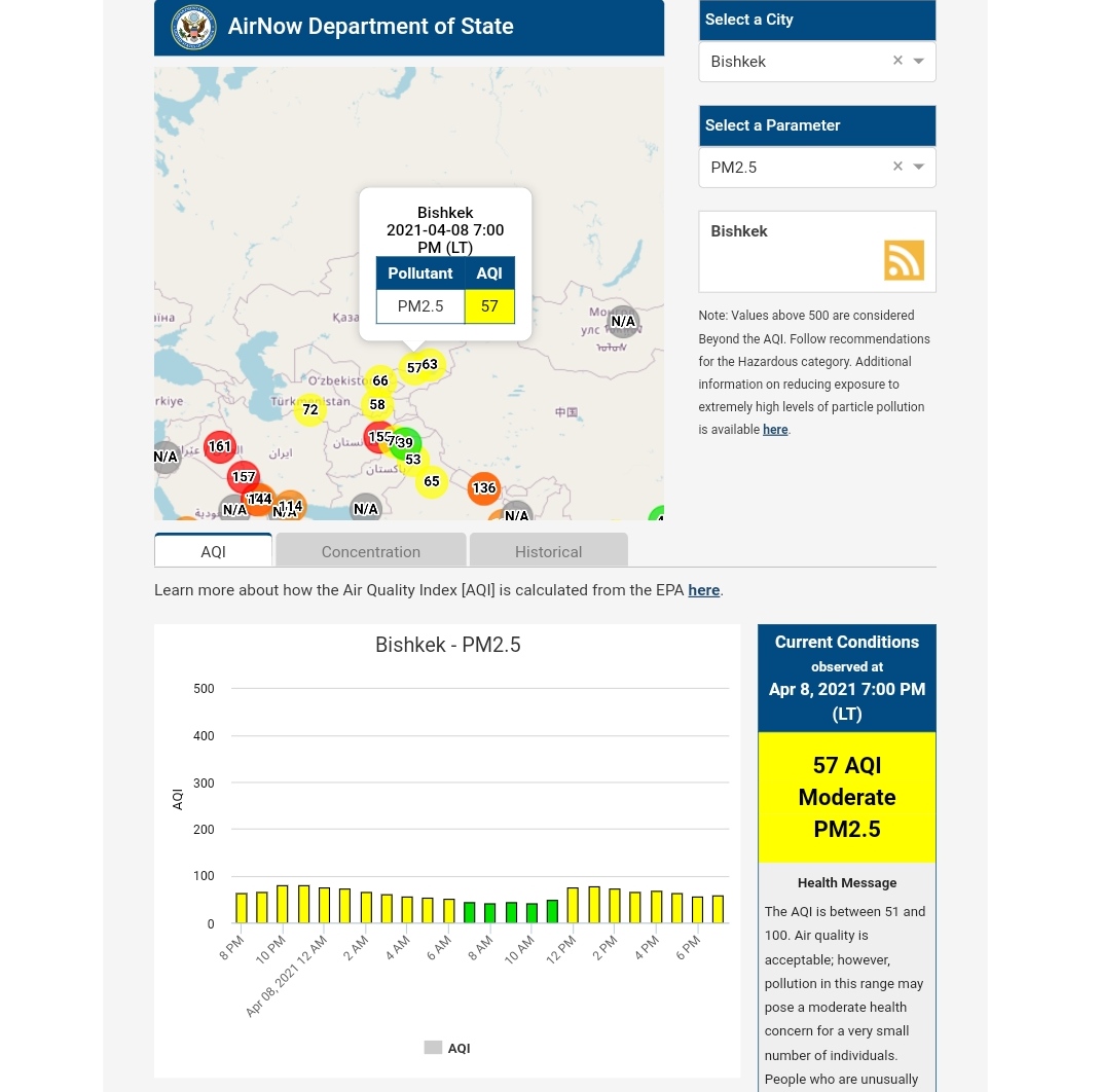 Посольство США в Кыргызстане также установило датчик. Информация обновляется каждый час. На 19.00 индекс качества воздуха в районе дипломатической миссии — 57 (AQI).