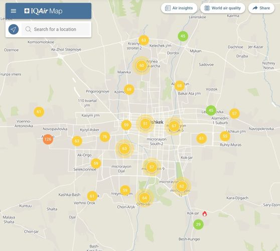 Общественный фонд «Институт экологических решений» установил датчики в столице и пригороде. На карте можно увидеть среднее значение AQI в разных районах Бишкека. Его обновляют ежечасно.