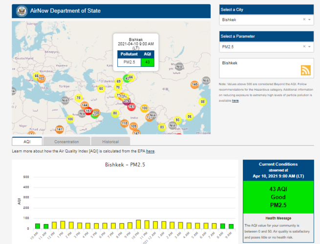 Посольство США в Кыргызстане также установило датчик. Информация обновляется каждый час. На 19.00 индекс качества воздуха в районе дипломатической миссии — 59 (AQI).