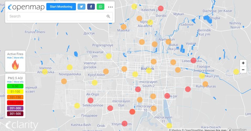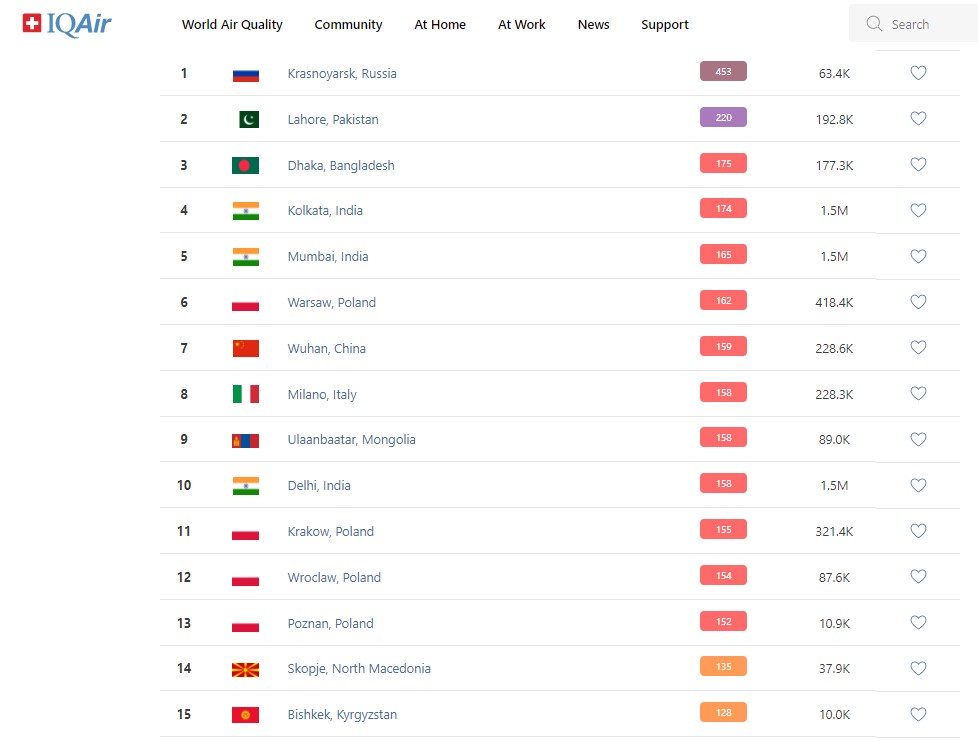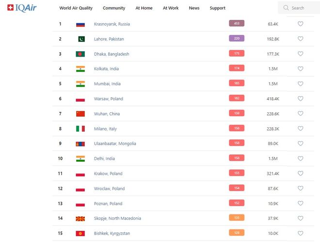 В рейтинге крупнейших городов мира по качеству воздуха World Air Quality Бишкек опустился на 15-е место.