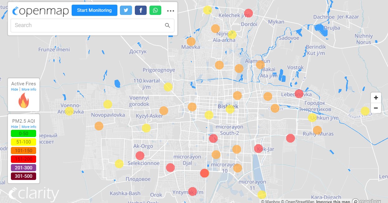 Посольство США в Кыргызстане также установило датчик. Информация обновляется каждый час. Индекс качества воздуха в районе дипломатической миссии — 139 (AQI).