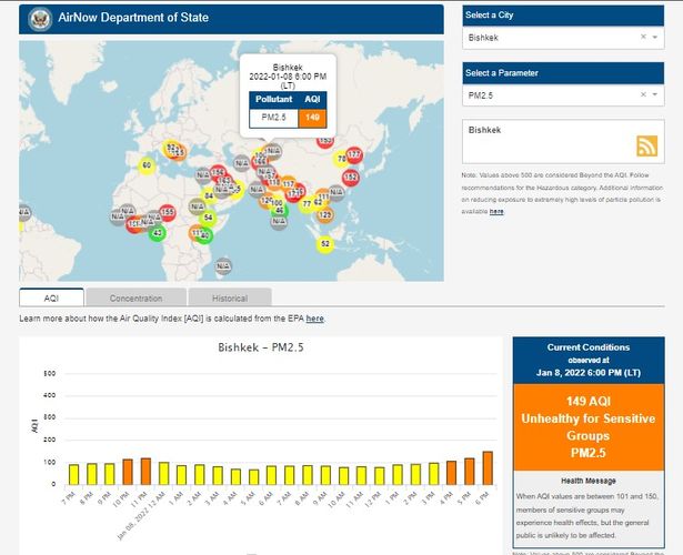 Посольство США в Кыргызстане также установило станцию. Информация обновляется каждый час. Индекс качества воздуха в районе дипломатической миссии — 149 (AQI).