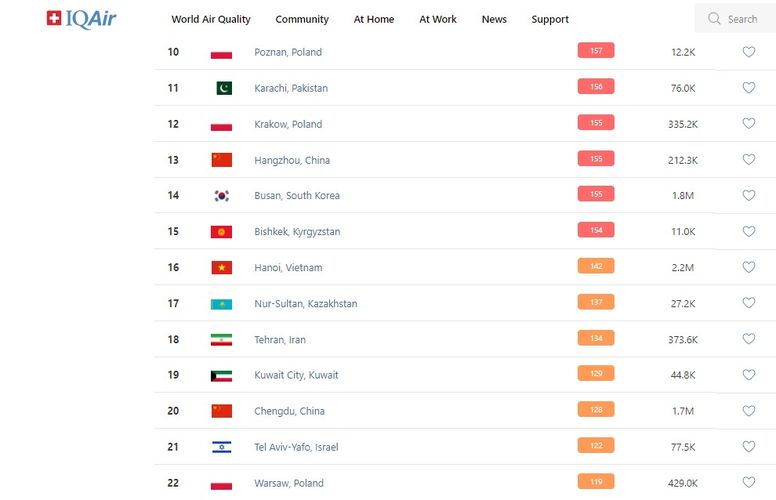 В 18.00 статус города отмечен как «нездоровый». Индекс качества воздуха, по данным сайта, составляет 154 (AQI).