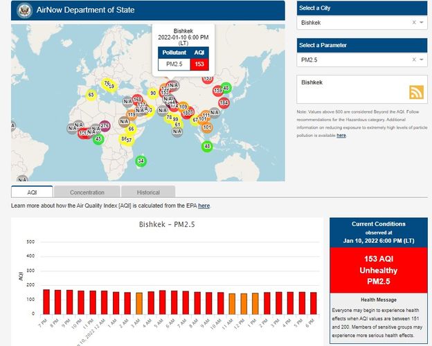 Посольство США в Кыргызстане также установило станцию. Информация обновляется каждый час. Индекс качества воздуха в районе дипломатической миссии — 153 (AQI).