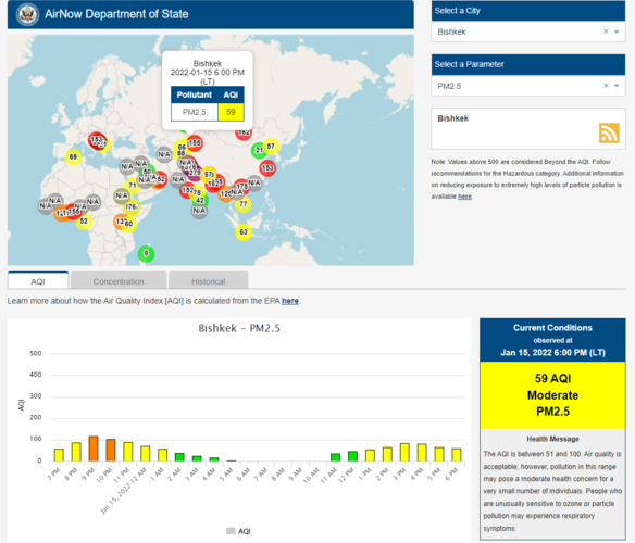 Посольство США в Кыргызстане также установило станцию. Информация обновляется каждый час. Индекс качества воздуха в районе дипломатической миссии — 59 (AQI).
