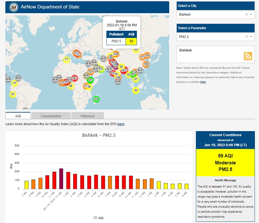 Посольство США в Кыргызстане также установило станцию. Информация обновляется каждый час. Индекс качества воздуха в районе дипломатической миссии — 59 (AQI).