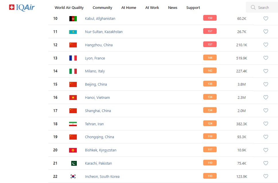 В рейтинге крупнейших городов мира по качеству воздуха World Air Quality Бишкек поднялся на 20-е место.