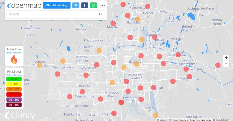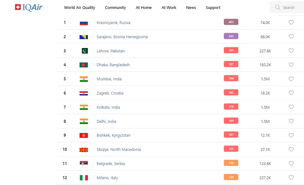 В рейтинге крупнейших городов мира по качеству воздуха World Air Quality Бишкек поднялся на 9-е место.