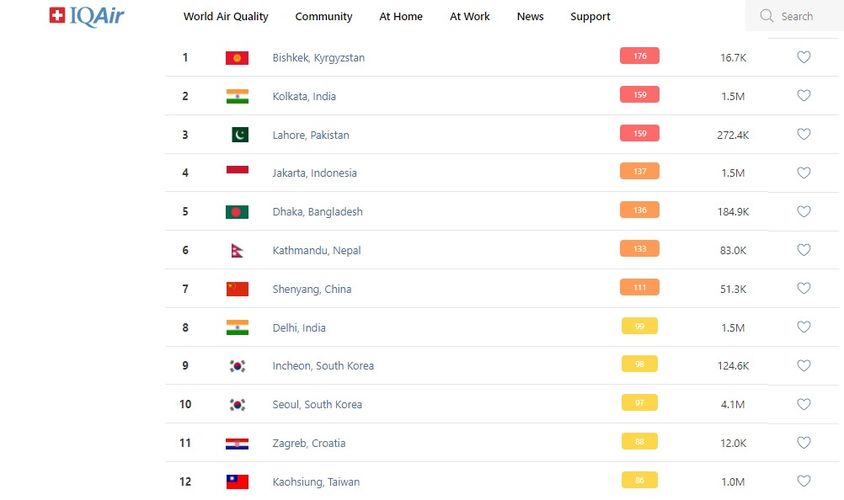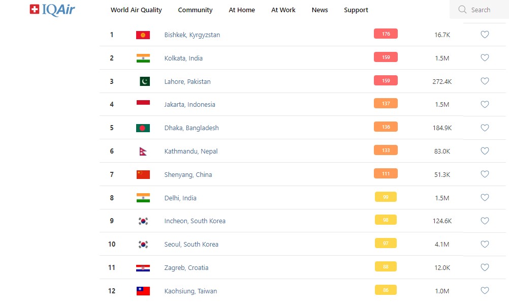 В рейтинге крупнейших городов мира по качеству воздуха World Air Quality Бишкек поднялся на 1-е место.