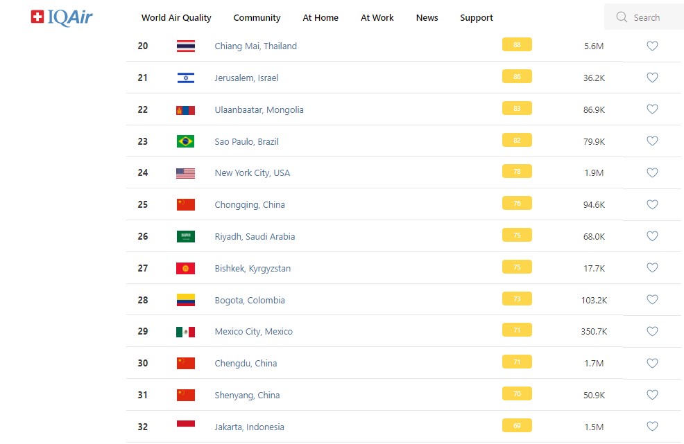 В рейтинге крупнейших городов мира по качеству воздуха World Air Quality Бишкек поднялся на 27-е место.