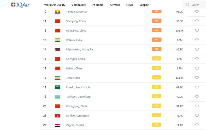 В рейтинге крупнейших городов мира по качеству воздуха World Air Quality Бишкек поднялся на 21-е место.