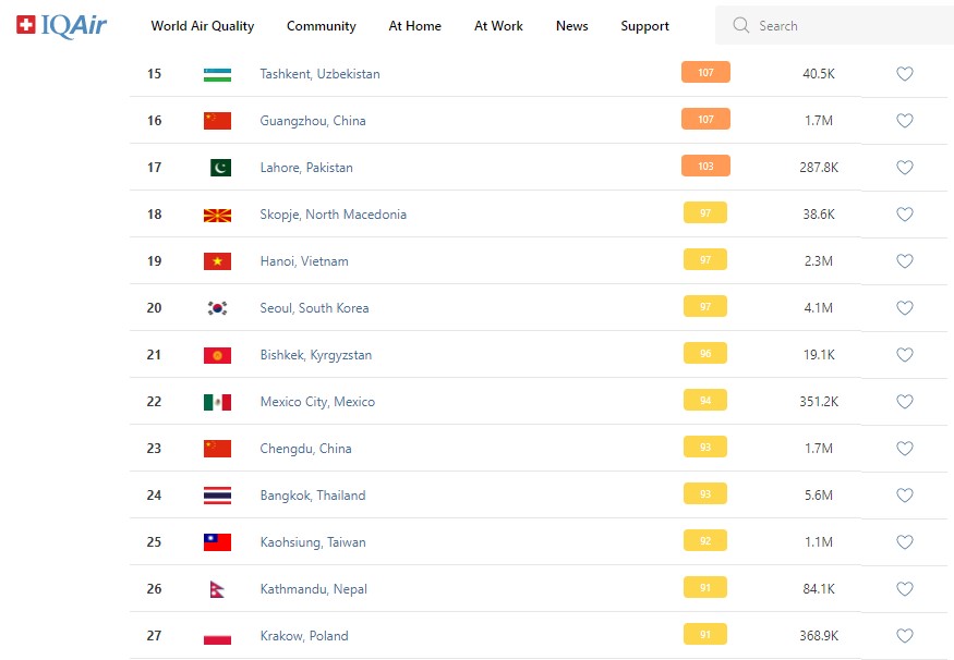 В рейтинге крупнейших городов мира по качеству воздуха World Air Quality Бишкек поднялся на 21-е место.