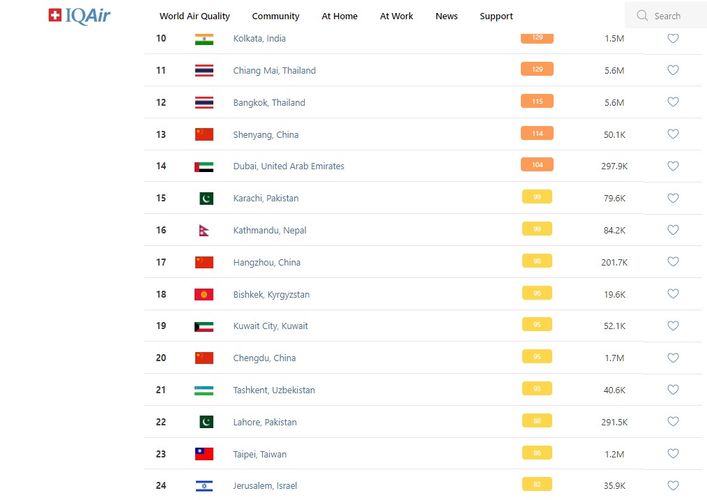 В рейтинге крупнейших городов мира по качеству воздуха World Air Quality Бишкек поднялся на 18-е место.