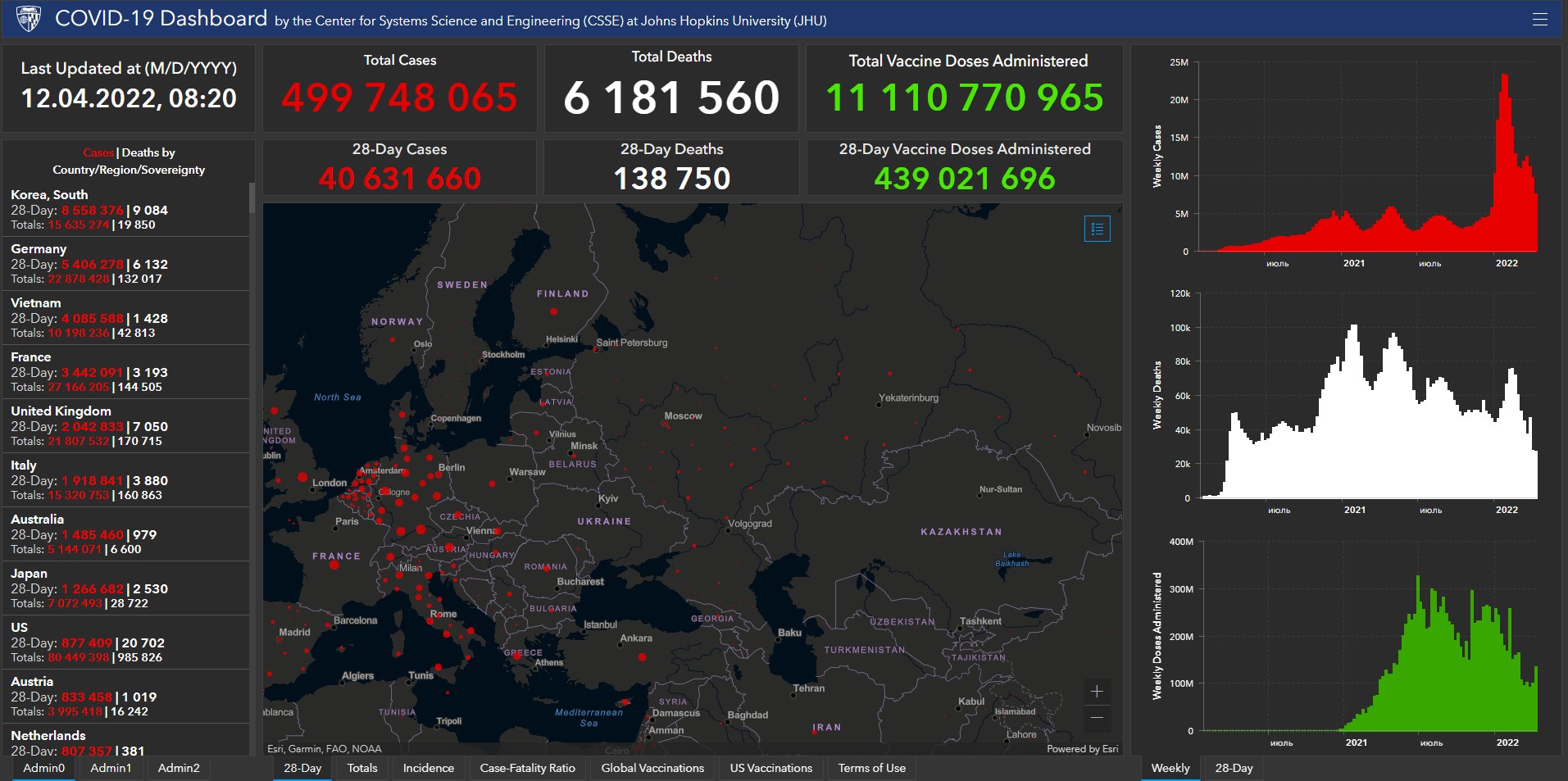 Всего в мире коронавирусом заразились 499 миллионов 748 тысяч 65 человек. Больше всего зараженных в США (80 миллионов 449 тысяч 398), Индии (43 миллиона 36 тысяч 132), Бразилии (30 миллионов 161 тысяча 909), Франции (27 миллионов 166 тысяч 205), Великобритании (21 миллион 807 тысяч 532), России (17 миллионов 745 тысяч 453), Турции (14 миллионов 965 тысяч 867), Аргентине (9 миллионов 54 тысячи 126), Иране (7 миллионов 194 тысячи 768), Колумбии (6 миллионов 88 тысяч 335), Испании (11 миллионов 627 тысяч 487), Италии (15 миллионов 320 тысяч 753) и Германии (22 миллиона 878 тысяч 428).