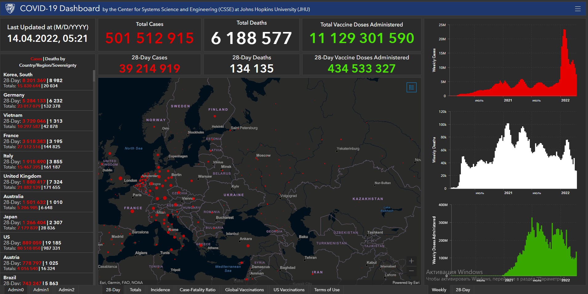 Всего в мире коронавирусом заразились 501 миллион 512 тысяч 915 человек. Больше всего зараженных в США (80 миллионов 518 тысяч 50), Индии (43 миллиона 38 тысяч 16), Бразилии (30 миллионов 210 тысяч 934), Франции (27 миллионов 512 тысяч 516), Великобритании (21 миллион 882 тысячи 139), России (17 миллионов 767 тысяч 760), Турции (14 миллионов 978 тысяч 31), Аргентине (9 миллионов 57 тысяч 923), Иране (7 миллионов 199 тысяч 861), Колумбии (6 миллионов 88 тысяч 912), Испании (11 миллионов 627 тысяч 487), Италии (15 миллионов 467 тысяч 395) и Германии (23 миллиона 17 тысяч 79).