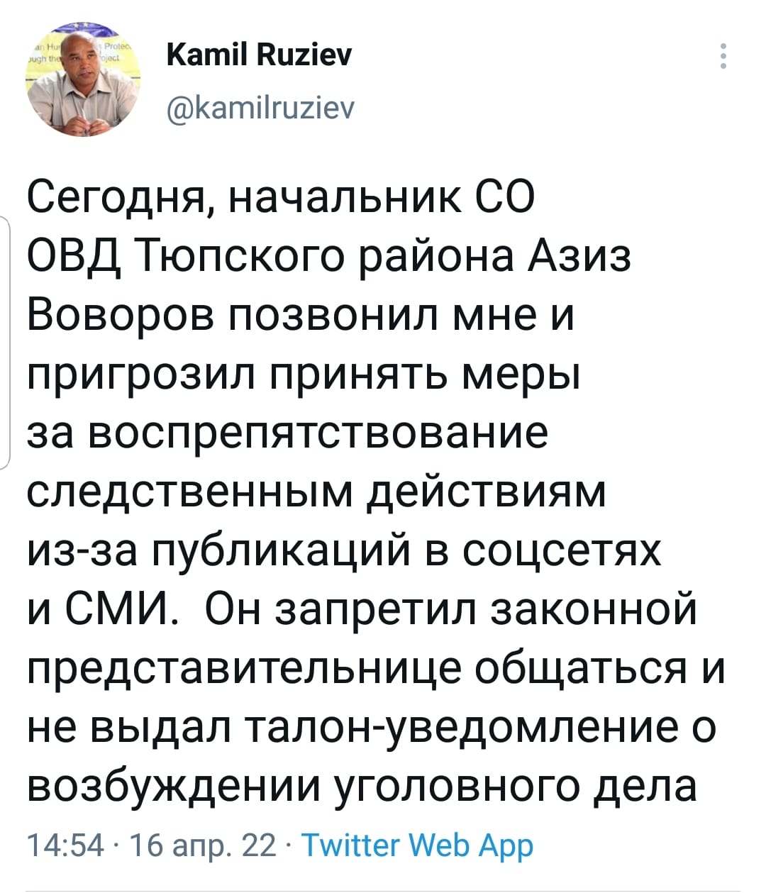 Правозащитник Камиль Рузиев написал в Twitter, что начальник следственного отдела Тюпского ОВД Азиз Воворов пригрозил ему принять меры, если не прекратит писать в соцсетях о нарушениях прав изнасилованной 16-летней девочки с инвалидностью.