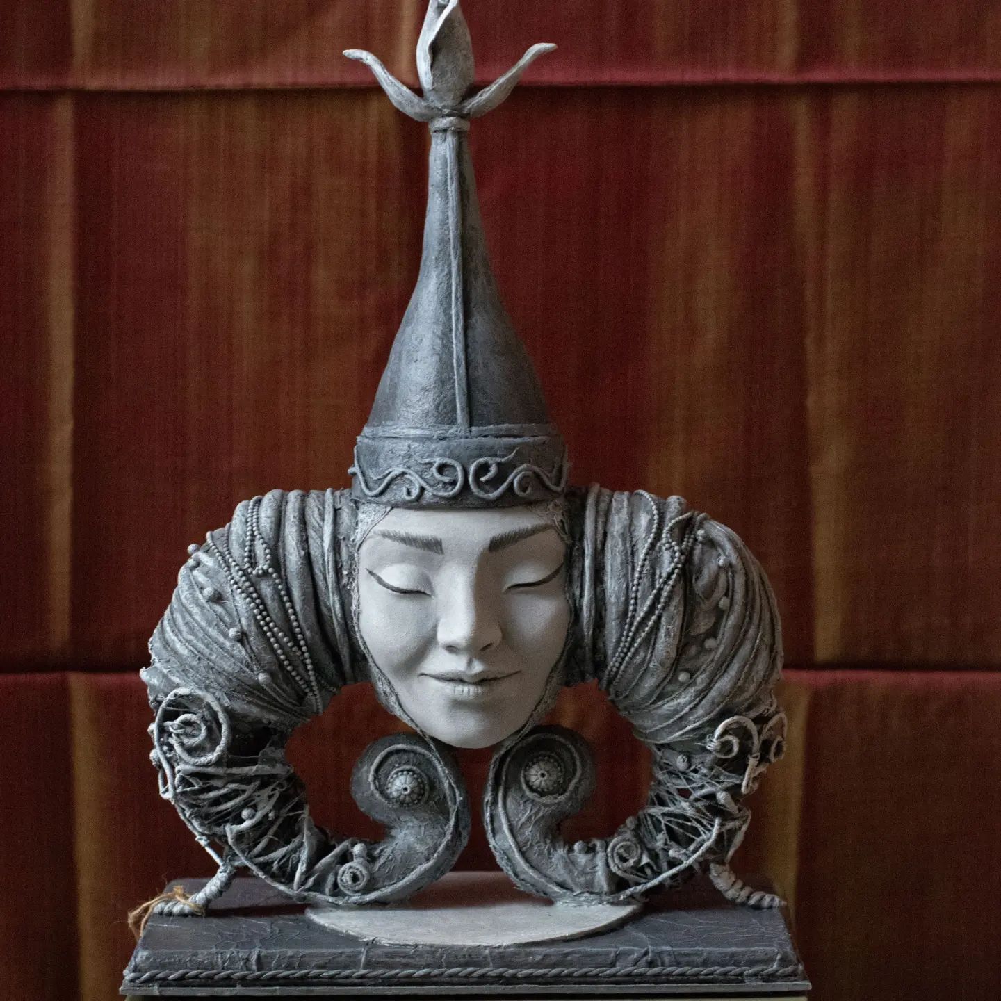 Так на выставке можно увидеть «Думы» — одну из новых работ известного мастера Натальи Копыловой. Собирательные образы Азии, Африки Японии выполнены из папье-маше и специального пластика.